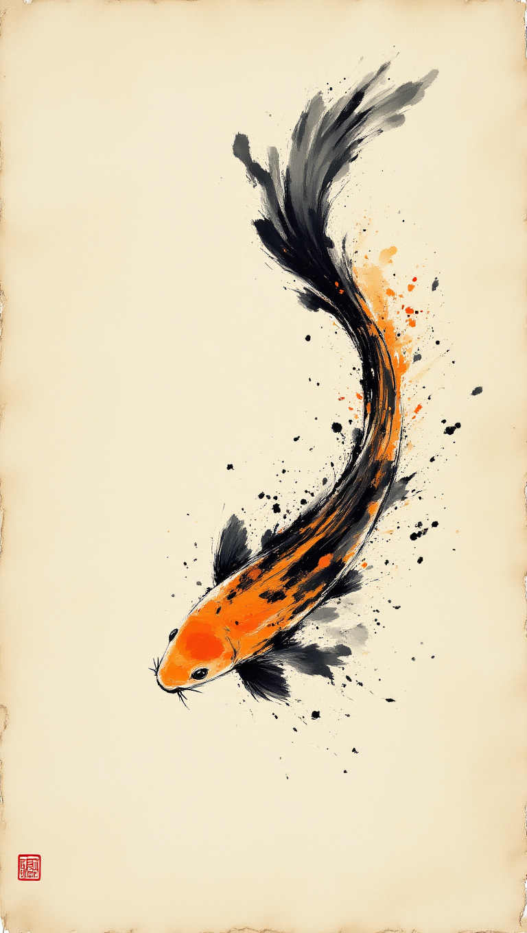 Image: Traditional East Asian brush painting of an orange koi with black accents swimming in an S-shape. Background resembles aged paper with a red seal.