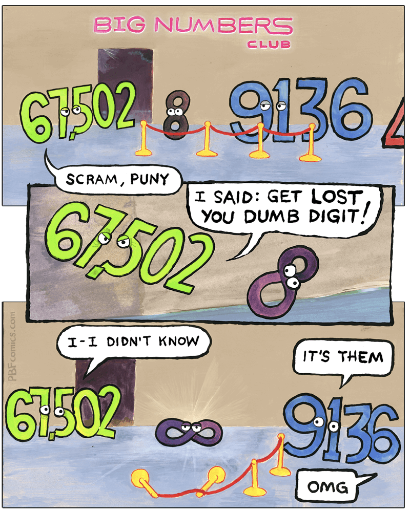 However, I want to point out an issue with what you said about those being different infinities… That isn’t strictly true. Natural numbers, rational numbers, and powers of ten are the same level of infinite. Crazy as it is to imagine, the sets can be functionally mapped to each other. They have the same infinite of elements to them. It isn’t until you add in those irrational numbers that the level of infinite increases. There is a higher order of infinite more numbers in the irrational numbers than in the rational numbers, so that infinite IS bigger.