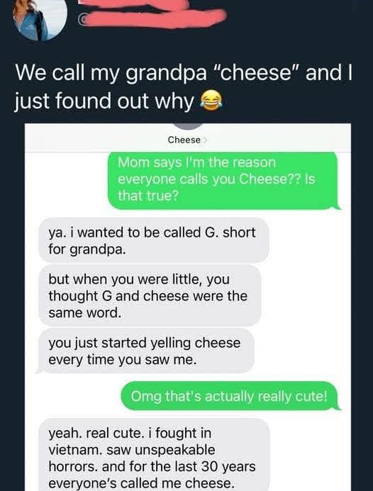 He was in the US military and now has the nickname ‘Cheese’ from his grandchild to be known by instead of the mentally abortive attempt his squad gave him?