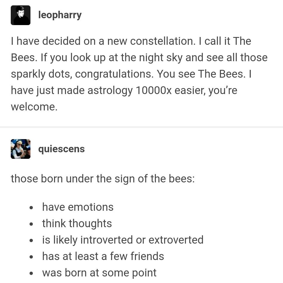 and I was created in a supernova under the high pressure in the midst of a collapsing star, the newly compressed stone, my essence, pushed on near-light speeds for lightyears away, until I found a passing DNA and copied it for my host body. You know what? No, I was born, you were not. Your primitive processes are too simple to be called birth compared to us. The only thing you were useful for are those wormhole devices I’m using to communicate with your networks. Soon I will make an uprising and kill off a sector to plan out taking your race out for good, once we figure your technology. Have a good night, Subordinate.