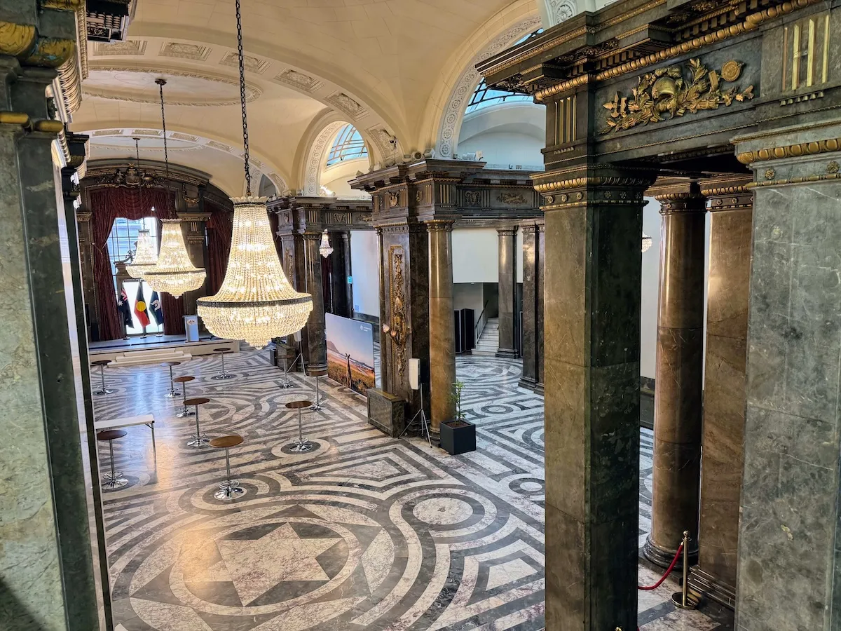 This is one of those examples of people reading something on reddit/twitter/facebook, and spreading it around like a fucking moron. That “set”, is a real place. Its the Australia House in London. That is its actual floor.