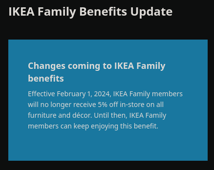 IKEA Family is a membership program, like grocery store memberships. The only real feature of the program was their 5% discount. But now, they are getting rid of it to focus on “New Lower Price offers”. I’m not holding my breath that their prices are going to come down anytime soon.