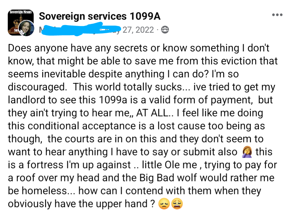 Right? The only “secret trick” that can save people from getting into this situation is that there is power in working together and forming tenant unions. Not some funny “state national” nonsense.