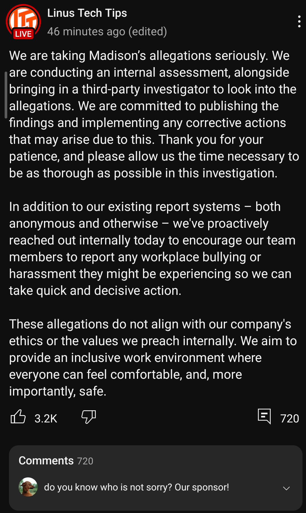 Linus might not have harassed anyone himself personally. But, if one of his employees harassed another of his employees, he is responsible. Worse, if he know and did basically nothing, then LMG neglected to act on its duty of care. Same reason why, when one employee goes in public to diss out and trash talk a competitor, then it’s as if it came out of Linus mouth, because it’s LMG speaking.