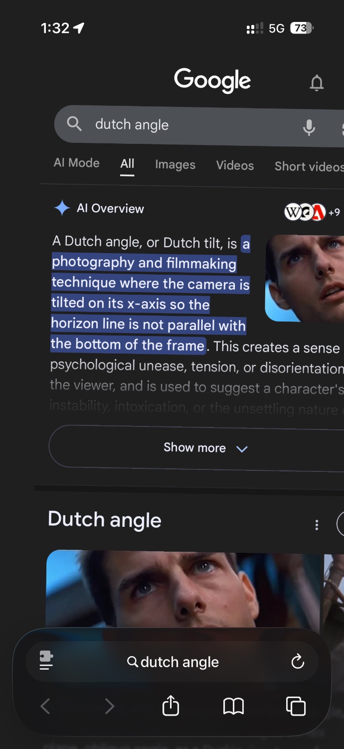 I didn’t know what a Dutch angle was so I googled it. I fucking hated the result. Give it a shot.